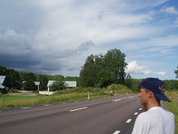 . Postanowiliśmy dojechać do Hudiksvall i tam, pod jakimś dachem, zjeść obiad. Kilka kilometrów przed miastem zaczęło jednak padać. Mając do wyboru podróż w deszczu i schronienie się na stacji benzynowej, wybraliśmy to drugie. Okazało się to zbawienne, bo po chwili nadeszła taka ulewa, że świata nie było widać. Na dokładkę Paweł zaważył, że jego tylna opona dość mocno zflaczała i musiał ją dopompować - na samą myśl, że moglibyśmy to robić na takim deszczu aż mnie ciarki przeszły. Na szczęście, po niecałych 30 minutach, zza chmur wyjrzało słońce i mogliśmy kontynuować podróż. Po kilkunastu minutach znowu stajemy - tylna opona Pawła jest znowu płaska. Powód jest jasny - dziurawa dętka. Co jakiś czas pompując, w końcu doczołgujemy się do Hudiksvall i na pierwszej stacji benzynowej zmieniamy dętkę na zapasową.